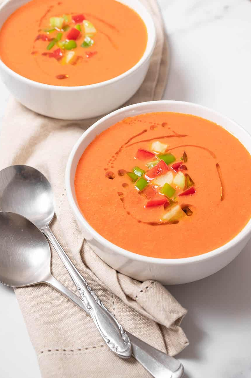 - Combine tomatoes, pepper, cucumber, onion and garlic in a blender. Blend at high speed until very smooth, at least 2 minutes.