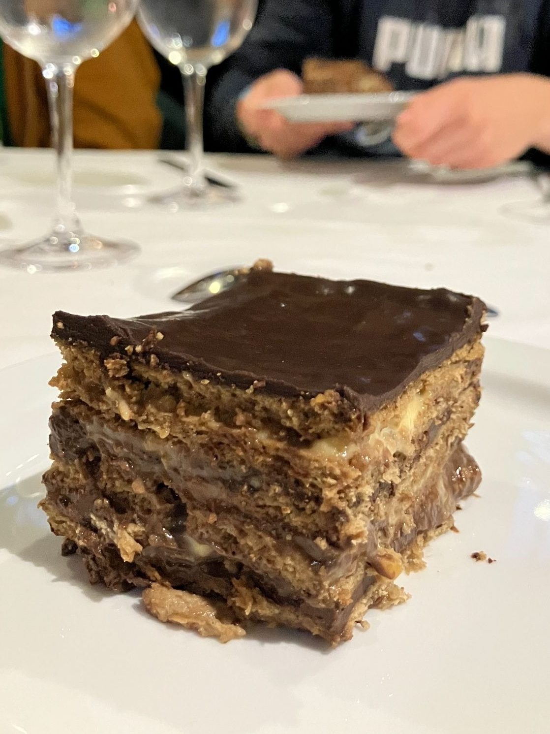 - In a rectangular dish, place a layer of the soaked biscuits. Pour some chocolate pudding, covering the biscuits. Repeat until all ingredients are used, finishing with a layer of chocolate pudding on top.